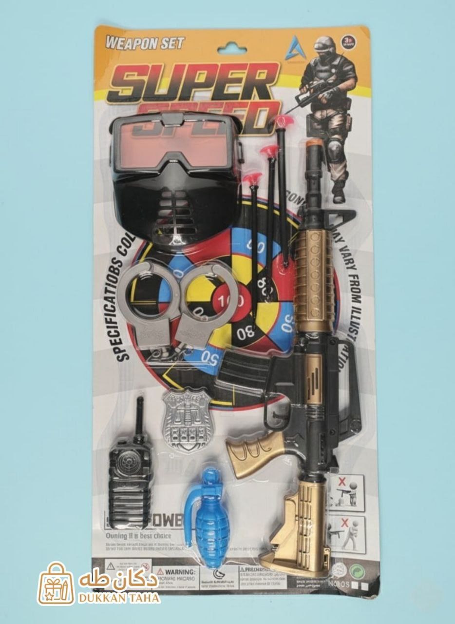 طقم المحارب للأطفال يشمل قناع، رشاش، قنبلة لعبة، شارة ولاسلكي، لتشجيع اللعب التخيلي ومغامرات الأبطال بطريقة مسلية وآمنة.