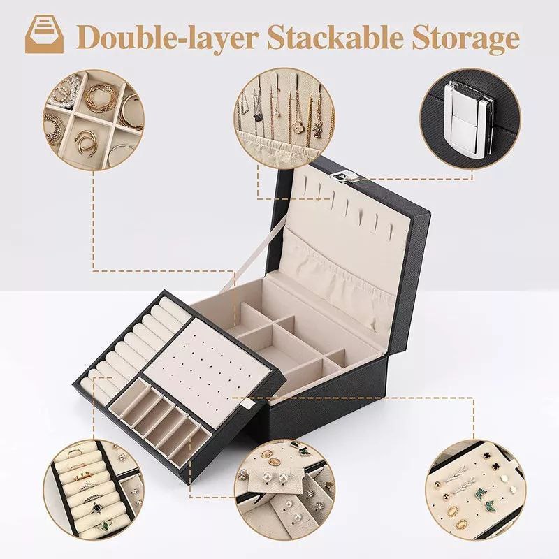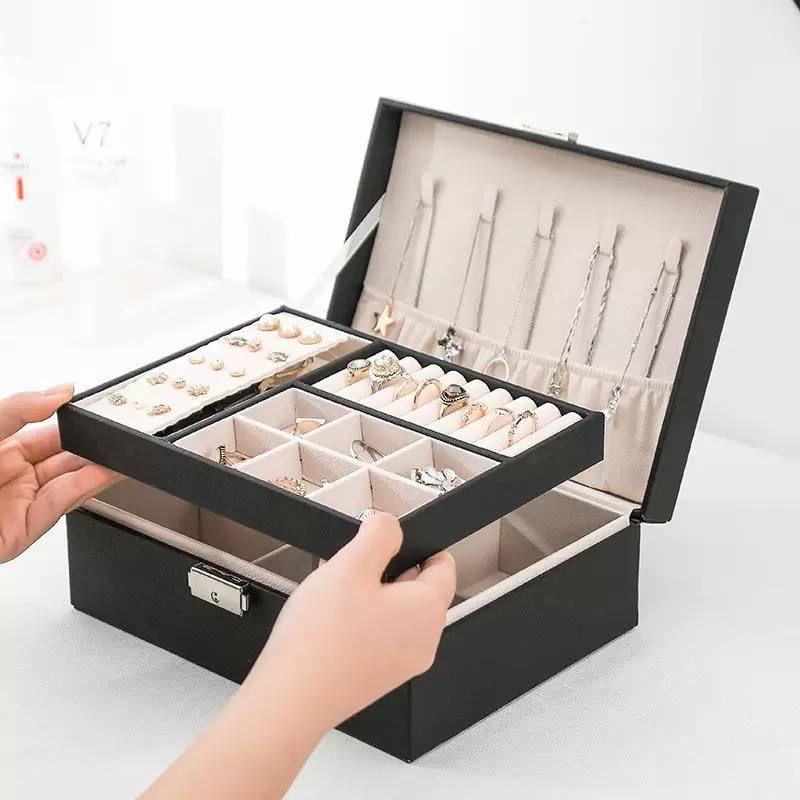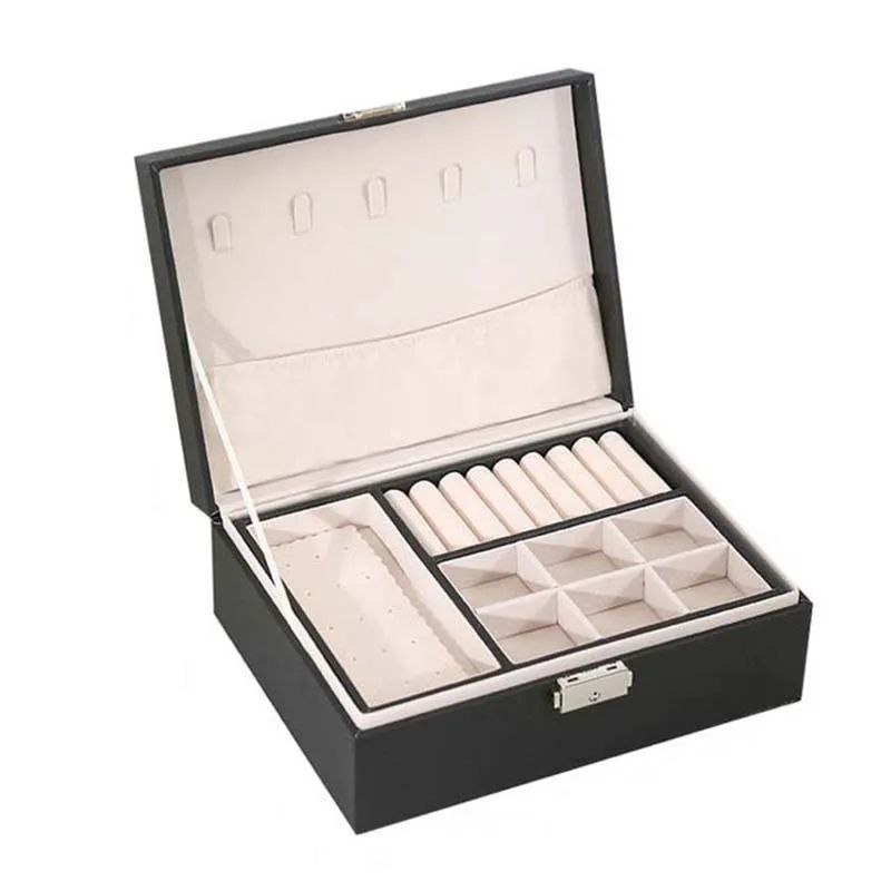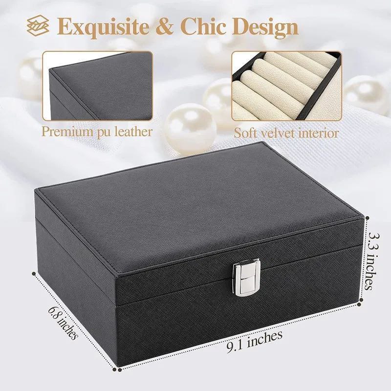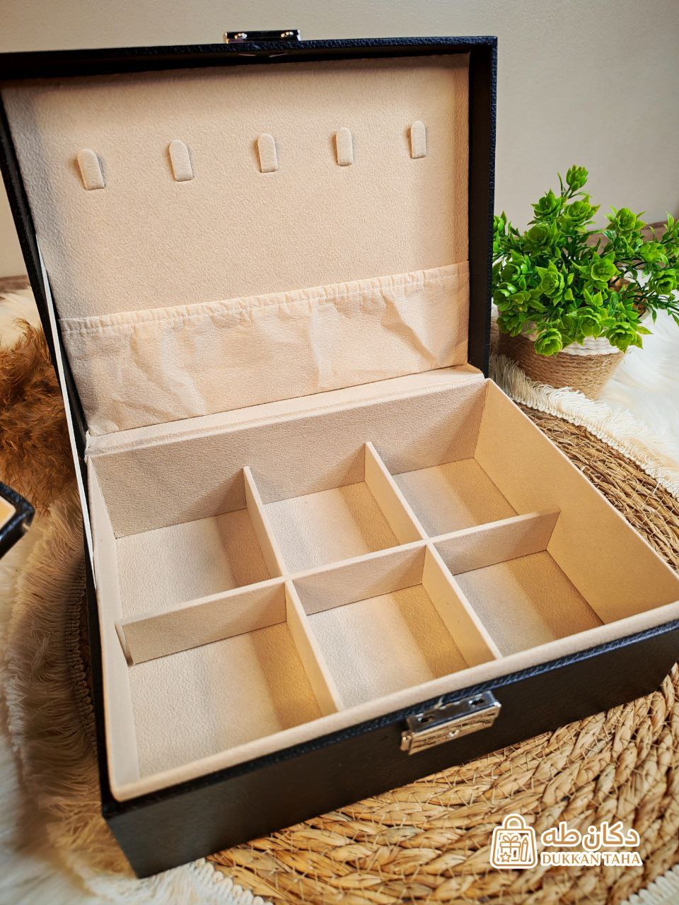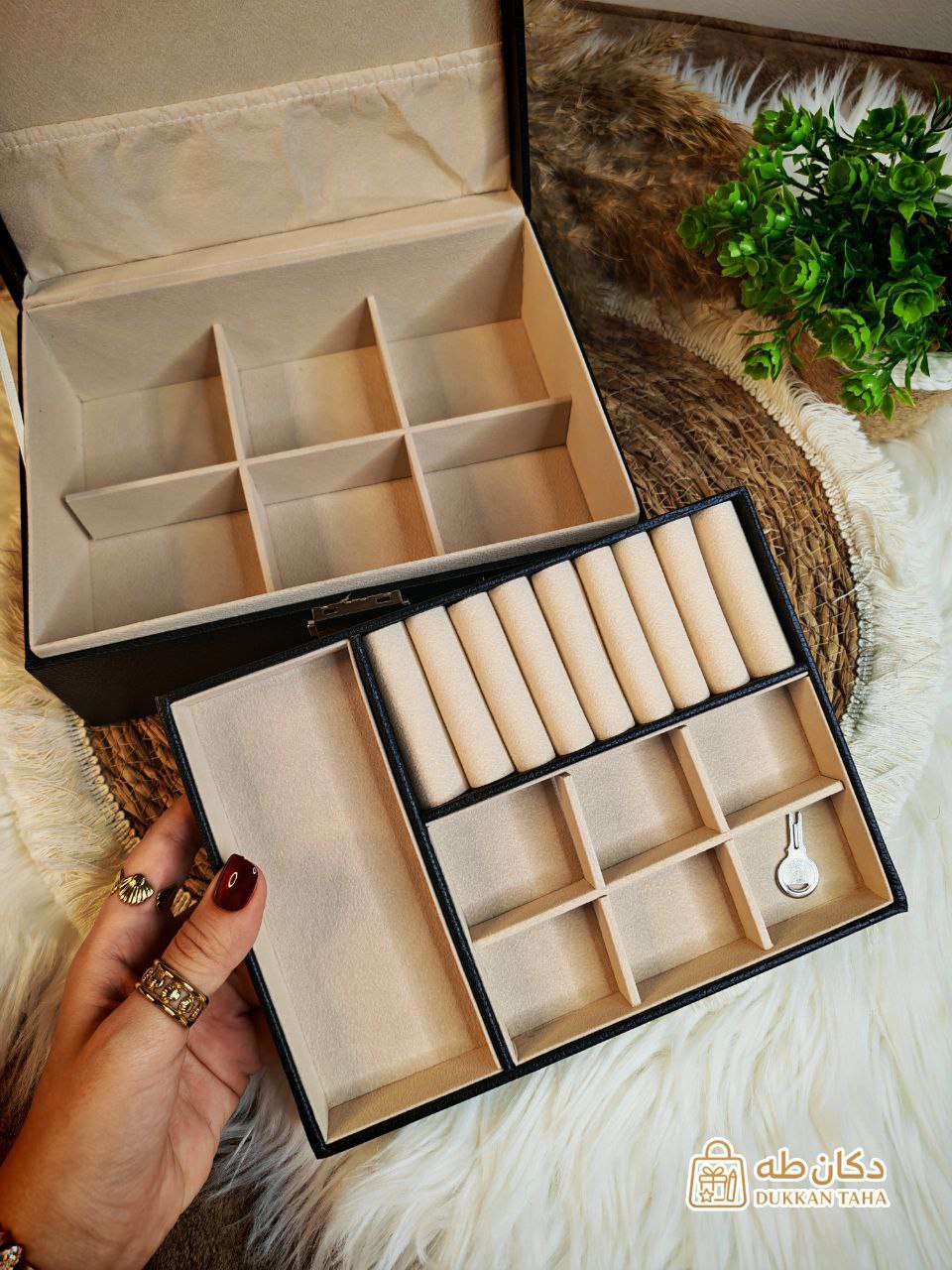 💎 علبة إكسسوارات جلد بمفتاح – تصميم أنيق بدورين للتنظيم.