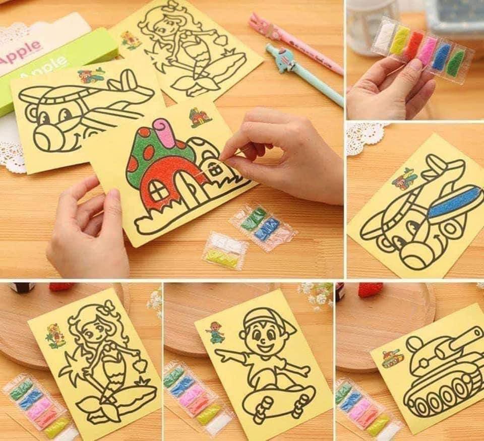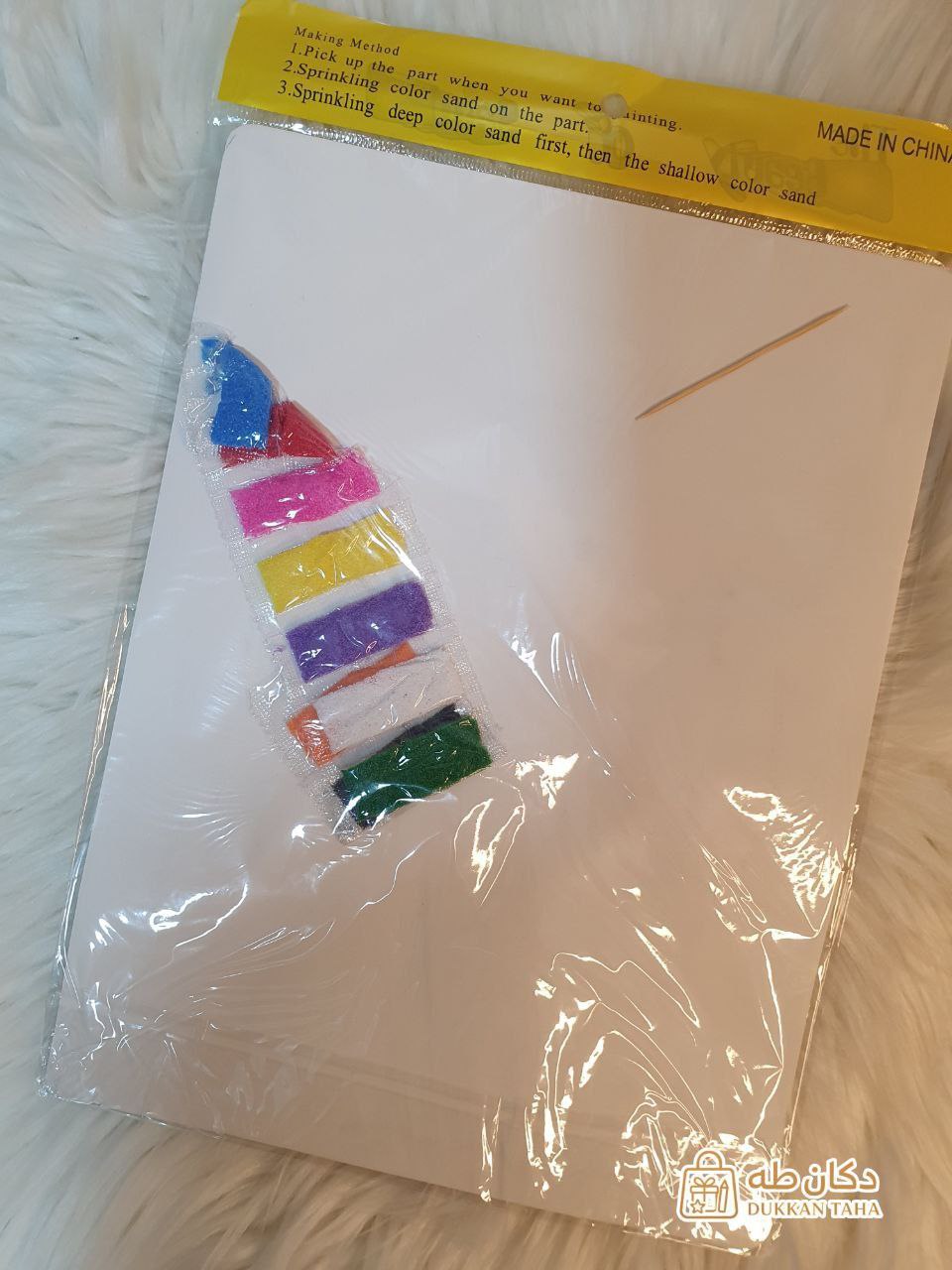 كارت تلوين بالرمل بطريقة جديدة ومسلية للأطفال، باستخدام خامات مختلفة لتنمية المهارات الفنية والإبداع. اللوحة مغطاة بطبقة صفراء تُنزع جزءًا جزءًا ثم يُرش الرمل الملوّن على المنطقة اللاصقة لصنع لوحة رائعة.